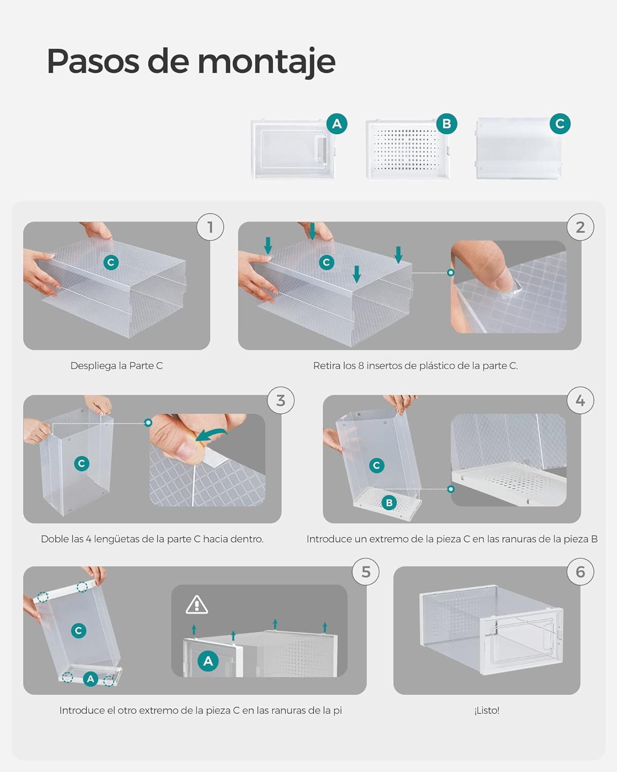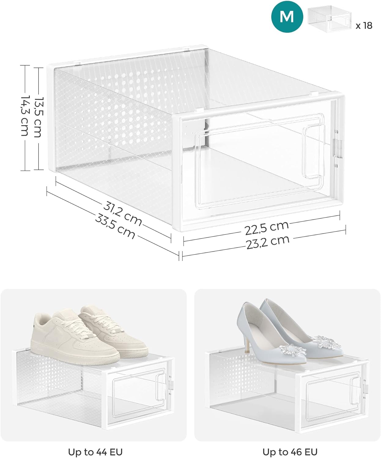 Scatole per Scarpe, Pacco da 18 Contenitori per Scarpe, Organizzatori Porta Scarpe Pieghevoli e Impilabili, Fino a Taglia 44, Trasparente e Bianco
